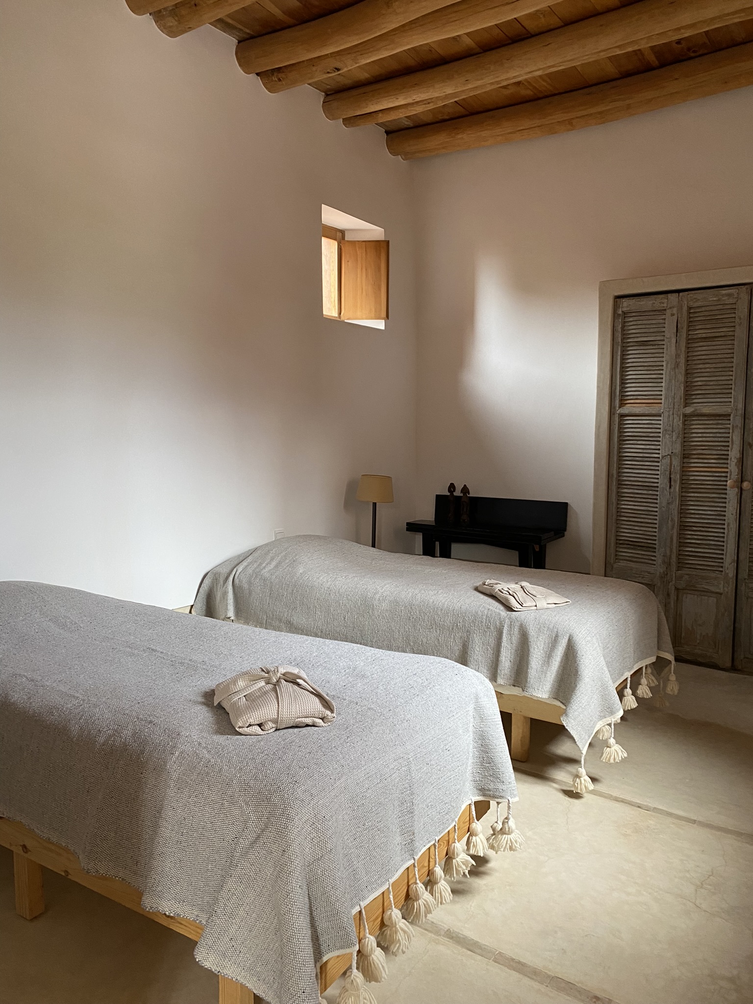 Les chambres sont réparties dans trois des quatre îlots qui entourent les deux cours intérieures. Cet agencement s’inspire de l’esprit d’un douar « chacun chez soi, tous ensemble ». Chacune des chambres est pourvue d’une terrasse privative et chacune jouit d’une vue apaisante sur les jardins et les campagnes avoisinantes. Les trois chambres dénommées Tafoukt, Wanina et Taoukert se trouvent au premier étage et profitent d’une magnifique vue sur les montagnes et la diversité de la campagne verdoyante à l’Ouest et plus minérale à l’Est.